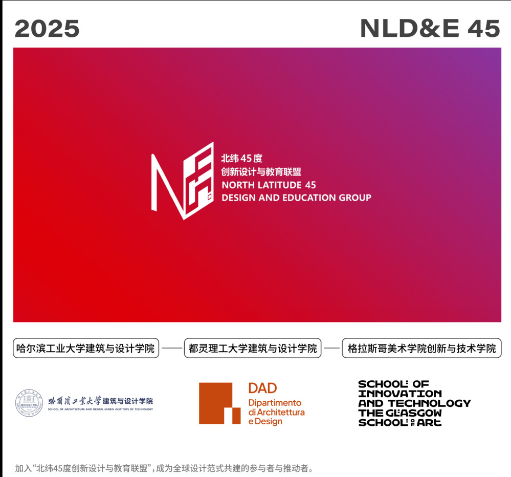 北纬45度创新设计与教育联盟(NLD&E 45)诞生于全球可持续发展与跨文化协作需求日益增长的时代背景下,由哈尔滨工业大学建筑与设计学院、都灵理工大学建筑与设计学院以及格拉斯哥美术学院创新与技术学院联合发起。