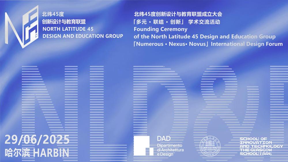 北纬45度创新设计与教育联盟(NLD&E 45)诞生于全球可持续发展与跨文化协作需求日益增长的时代背景下,由哈尔滨工业大学建筑与设计学院、意大利都灵理工大学建筑与设计学院以及英国格拉斯哥美术学院创新与技术学院联合发起。
